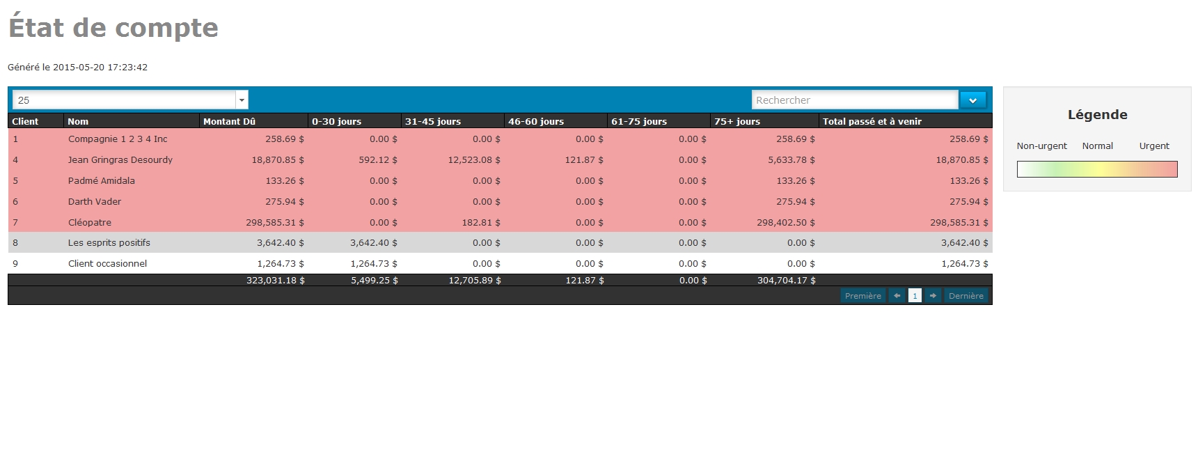 L’état de compte regroupe la liste des clients qui ont des créances. Le code couleur permet d’identifier les retards de paiement selon l’ordre de priorité