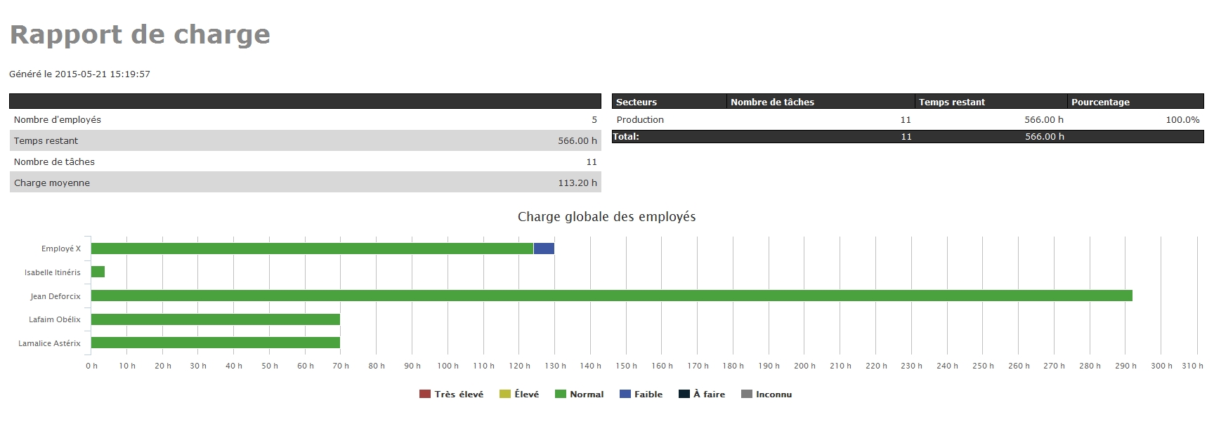 Dans notre exemple, Isabelle Itinéris a peu de temps de travail prévu sur une tâche. (ex ici : rapport établi pour les projets échus à la fin du mois, tous projets confondus de l’entreprise)